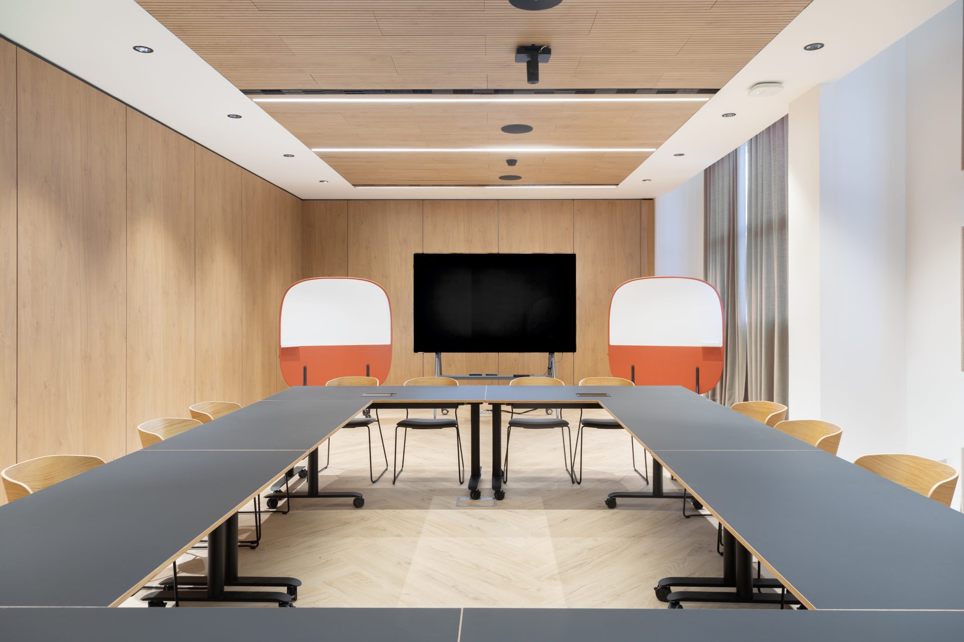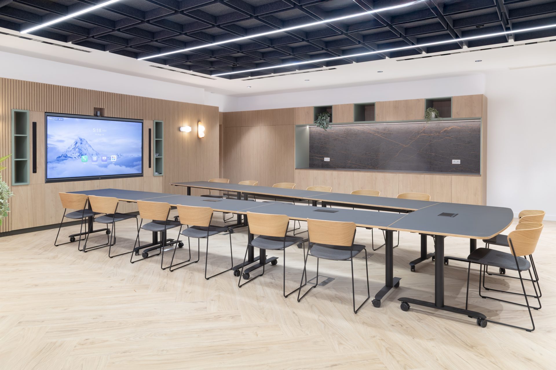 • Salas de Formación Flexibles: Estas salas adyacentes al auditorio cuentan con mobiliario flexible, facilitando la adaptación rápida del espacio a diferentes dinámicas de uso.