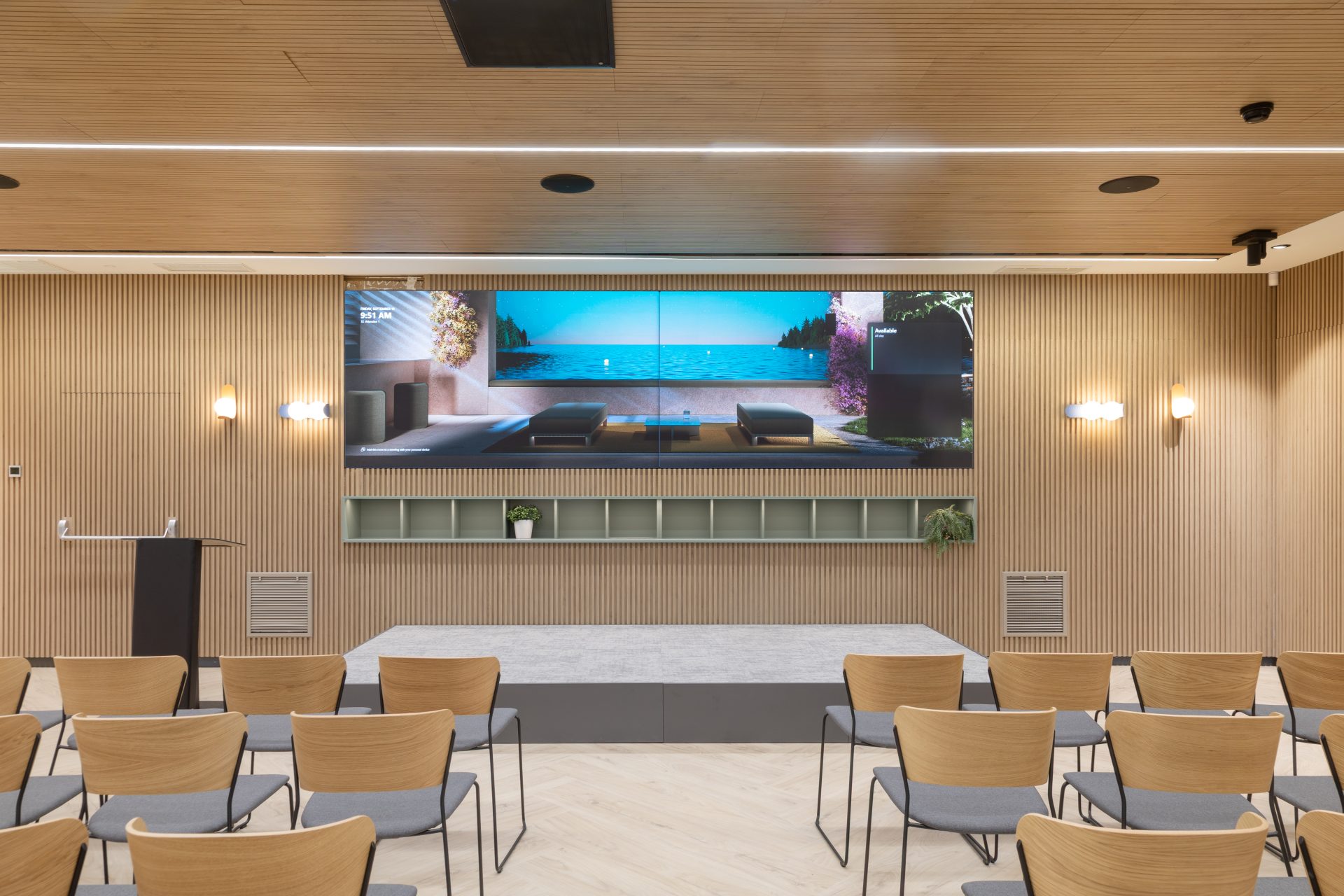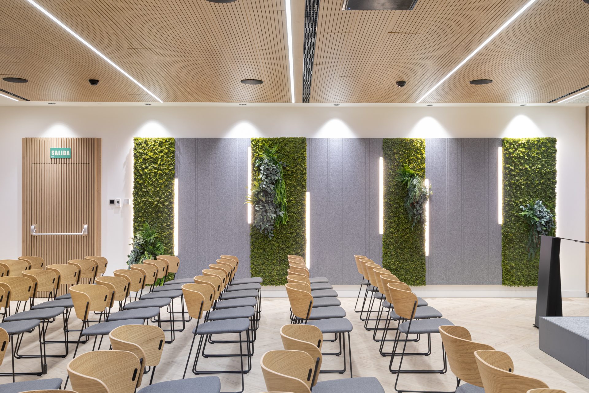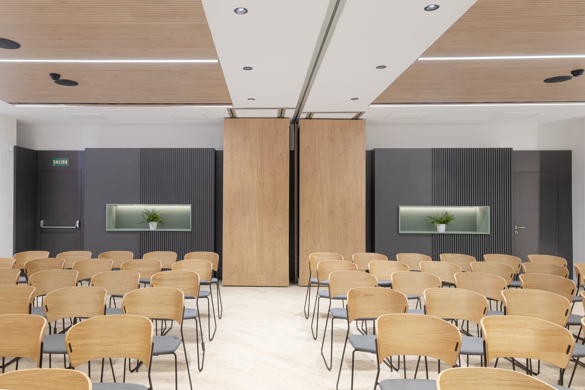 • Auditorio: Se ha diseñado un auditorio principal que incorpora un tabique móvil, permitiendo dividir el espacio para crear un auditorio más pequeño y dos salas de formación independientes.